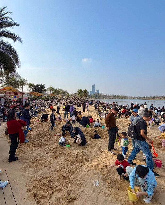 前一天,她带孩子去了东安湖银沙滩。本思着趁假期减轻一下,没思到刚到不久,就剖析到我方“低估了这座城市的热度”。目下,沙滩上密密匝匝全是小一又友,五彩的小桶、小铲子铺了一地。她回来看见自家孩子正蹲在沙堆里专注“施工”,小脸脏兮兮却笑得灿烂。那一刻,她欷歔:这种“东谈主山东谈主海”,其实恰是年味的另一种注脚。