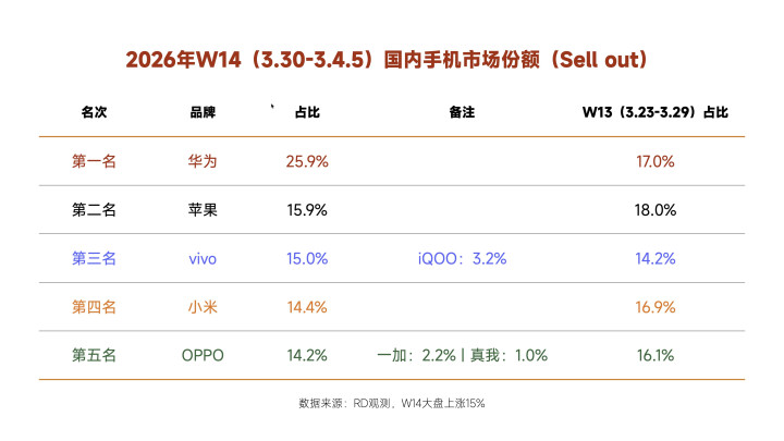 今天共享的是2026年W14(3.30-4.5)国内手机畅销榜,本周最大的看点是iPhone17Pro Max仅排行第二,击败该机的的手华为畅享90 Pro Max,同期以40万+的周销量遥遥跳跃。除此除外,同期开售的华为畅享90Plus也很惊艳,以9.5万台的销量排行第六,以下是该机的详备执行。(数据开首颖慧芯片案内东说念主)