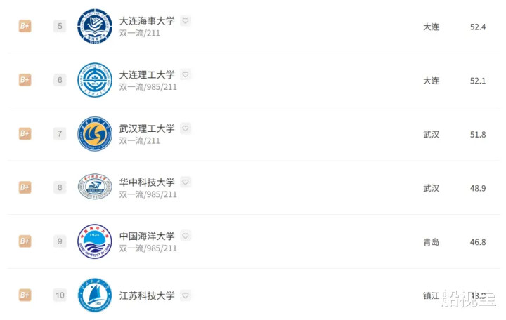 大连海事大学、大连理工大学、武汉理工大学、华中科技大学、中国海洋大学、江苏科技大学,分列5-10名,取得“B+”