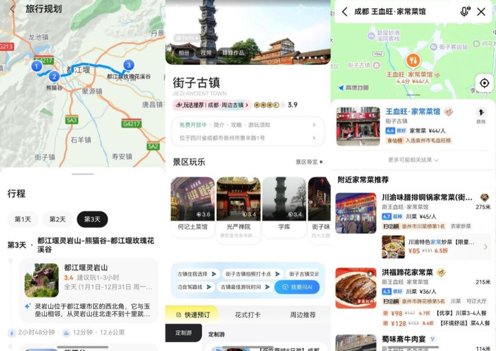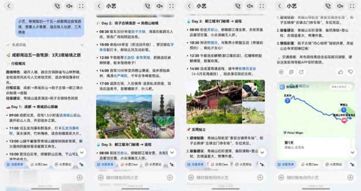 两分钟后,一份图文并茂的专属路书就呈目前目下。小艺给出了一条“反向旅游”道路:第一天从成皆市区开赴,直奔青城山后山,淹没东谈主流,开启徒步之旅;第二天赶赴街子古镇和凤栖山,慢悠悠逛一天;第三天领受皆江堰的冷门秘境“灵岩山”,能俯视全景,还能走访超萌的熊猫谷。