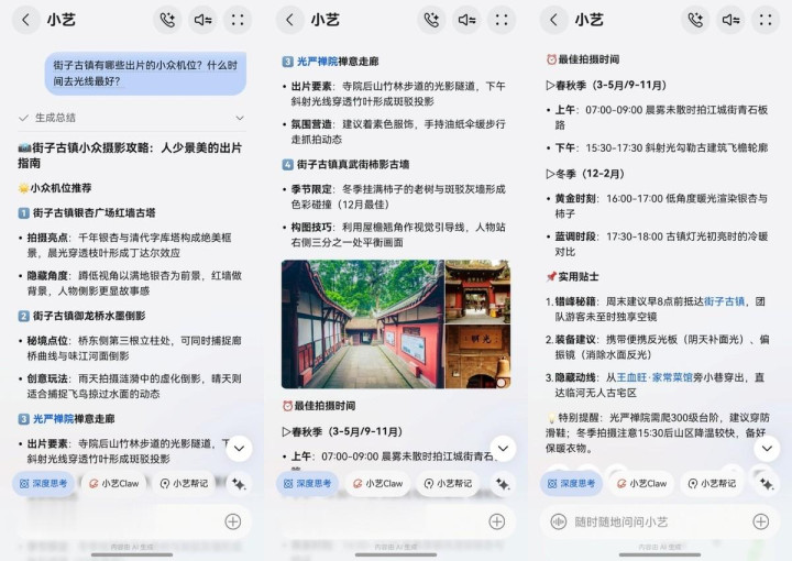 我再次叫醒小艺:“街子古镇有哪些出片的小众机位?什么技艺去晴朗最佳?”