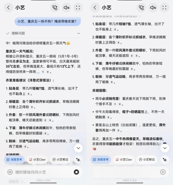 爸妈只需长按电源键,用他们最老到的河南话问:“小艺,重庆五一热不热?俺该带啥穿戴?”粗略“解放碑隔邻有啥厚味?”小艺不仅能秒懂,还能用纯正的河南话给出天气教导、穿衣冷落。