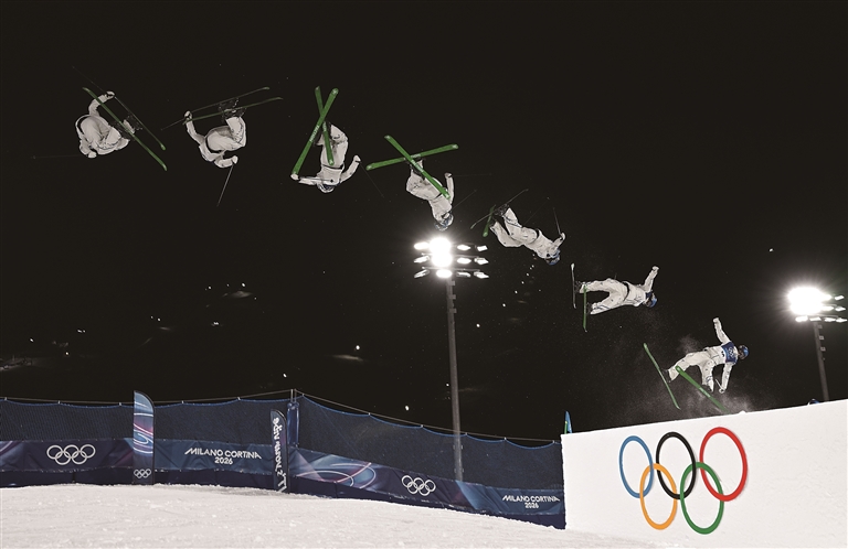 当地时候2月14日,中国选手谷爱凌在解放式滑雪女子大跳台资历赛中(多重曝光相片)。新华社记者 夏一方摄