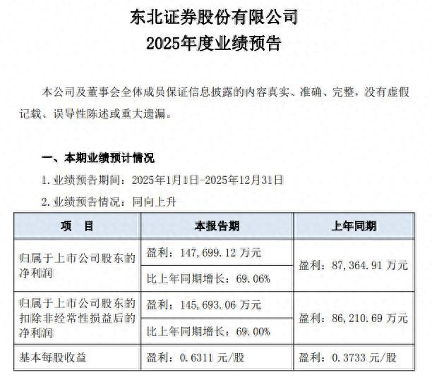 公司预计2025年归母净利润达14.77亿元,同比增长69.06%;扣非后归母净利润达14.57亿元,同比增长69%;基本每股收益达0.6311元/股。公司称,利润增长主要是投资业务收益及财富管理业务收入增加所致。