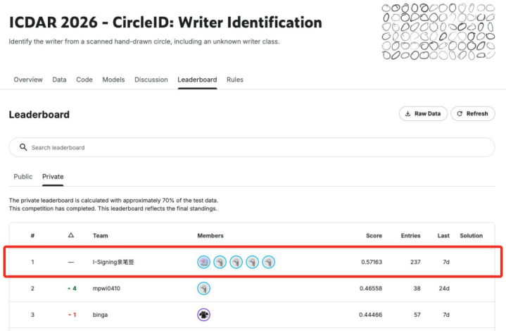 日前,在ICDAR2026-CircleID:WriterIdentification(圆圈书写者身份识别)寰球挑战赛中,来骄矜庆两江新区的企业重庆亲笔签数字科技有限公司(以下简称“亲笔签”)的算法民众覃勋辉指点团队,力压寰球113支参赛队列,以超第二名10.6个百分点的完全上风斩获宇宙第一。