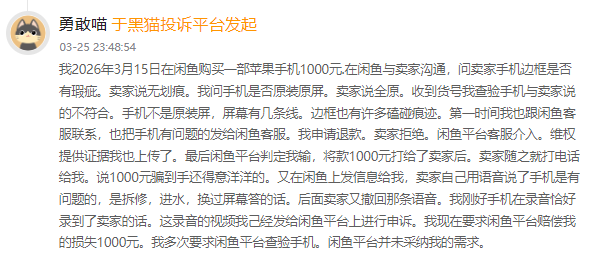 “在闲鱼购买苹果17Pro max手机一部,使用第6天的时候,手机蓦然白屏,去线下苹果官方售后店检测,屏幕存在首要问题,不是官方屏幕手机虽在质保期内但无法享受质保。商家的质检叙述是全原无拆修原装屏幕,存在诈骗阔绰,商家以撕毁标签为由,不退款,而平台竟然说无法判别有质料问题”